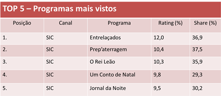 A véspera de Natal deste ano chamou particular atenção para este fenómeno, já que foram os filmes de animação que dominaram as audiências nos canais generalistas portugueses. A SIC liderou com uma grelha de programação dirigida sobretudo aos mais jovens. Desde os Entrelaçados ao Rei Leão, este foi o canal preferido para as famílias portuguesas passarem o dia da consoada. Com cerca de 30% de share, a estação de Carnaxide destacou-se com o Natal Encantado. Cinema para toda a família e todo falado em português, a oferta incluiu grandes clássicos e estreias encantadoras.